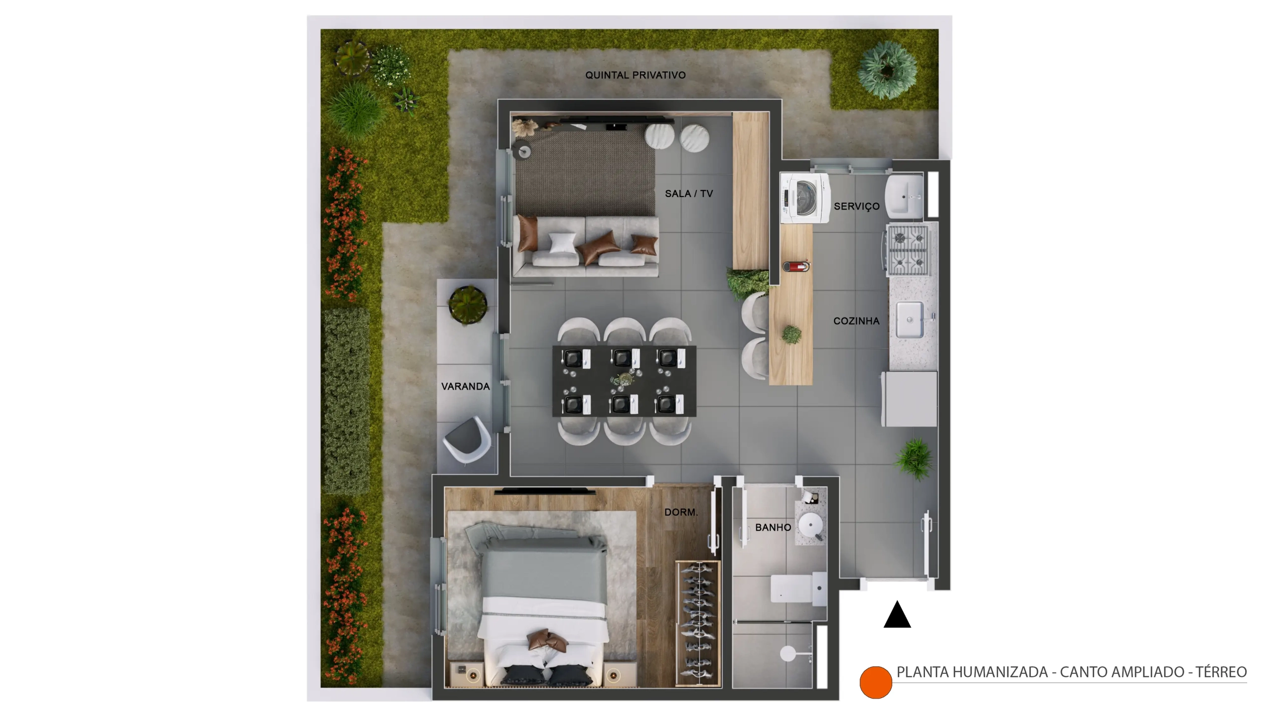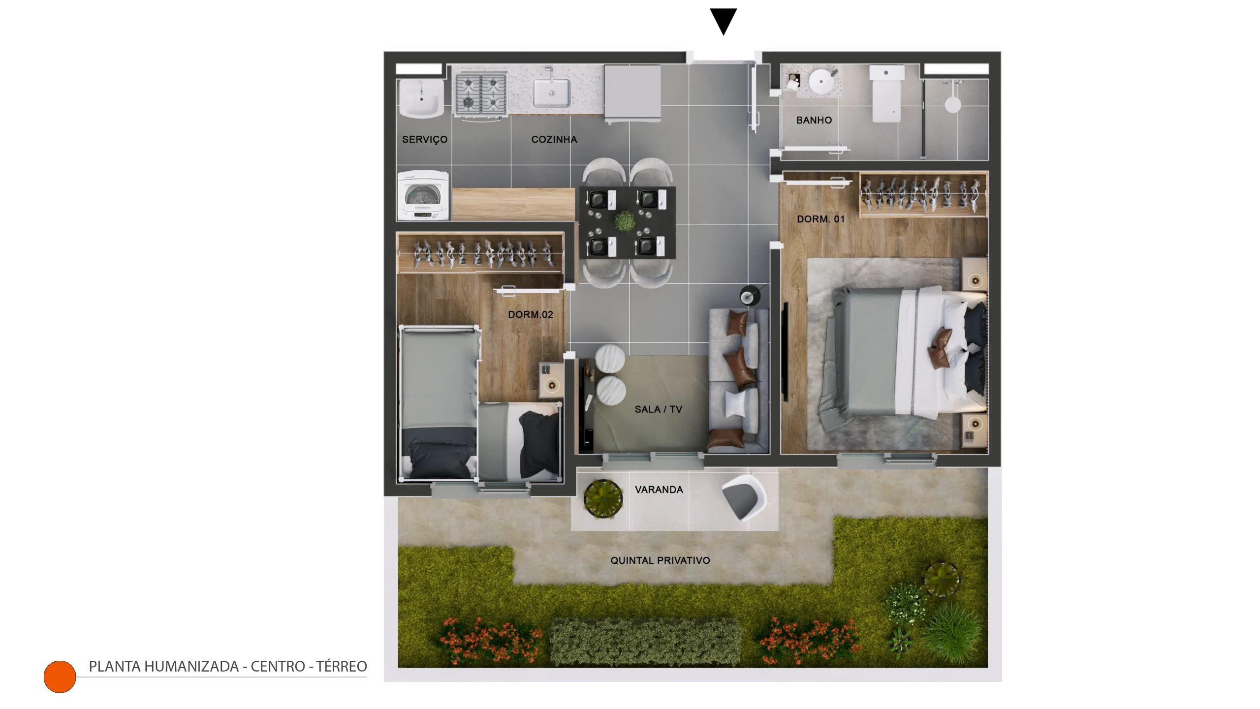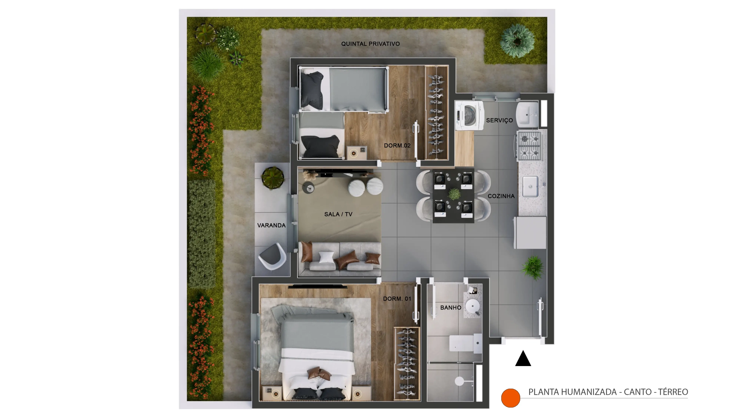 Apartamento térreo de canto com 40,61m² de área privativa + quintal privativo de 21,77m². Composição: 2 dormitórios, 1 banheiro, varanda, sala integrada, cozinha, área de serviço, 1 vaga de garagem. Posição de canto privilegiada com o maior quintal privativo do empreendimento. Ideal para quem tem pets, crianças ou busca mais espaço ao ar livre. Disponível nos Blocos 01, 02 e 03.