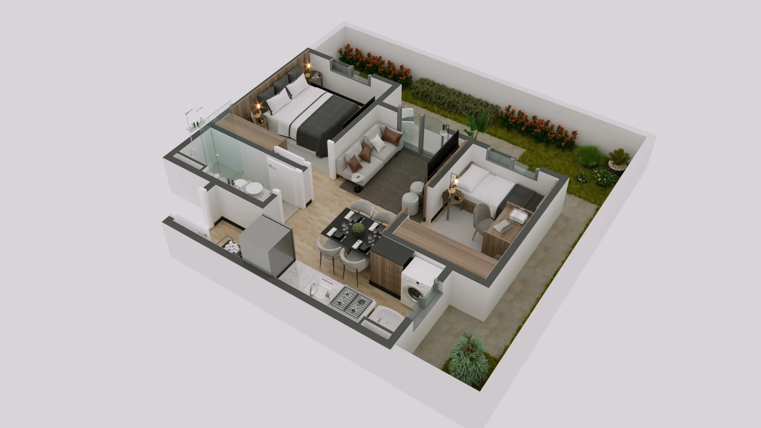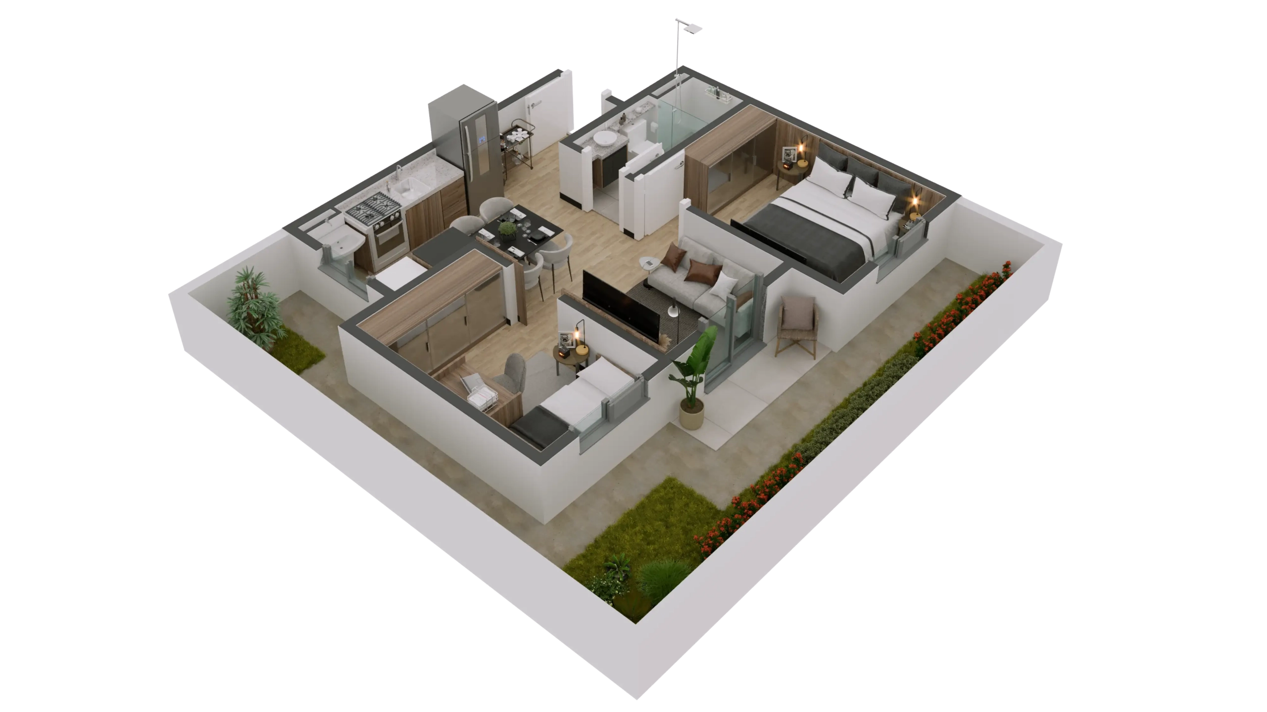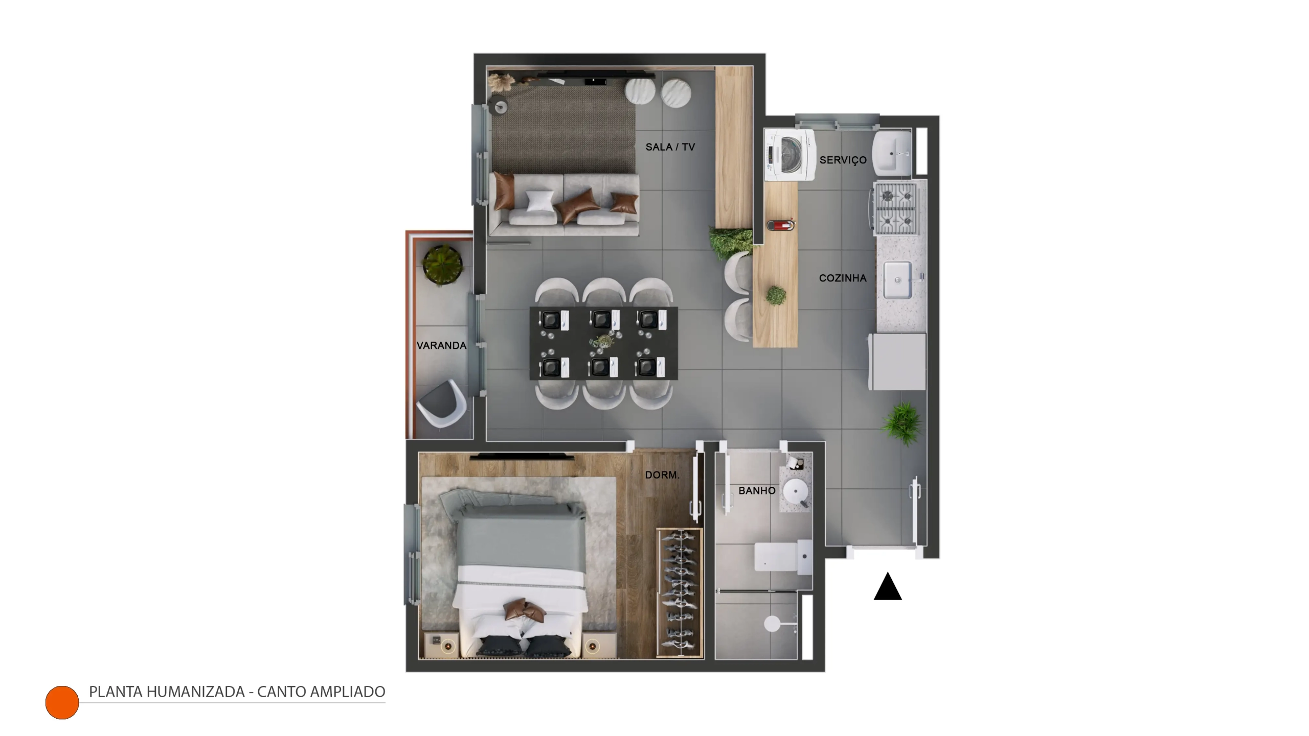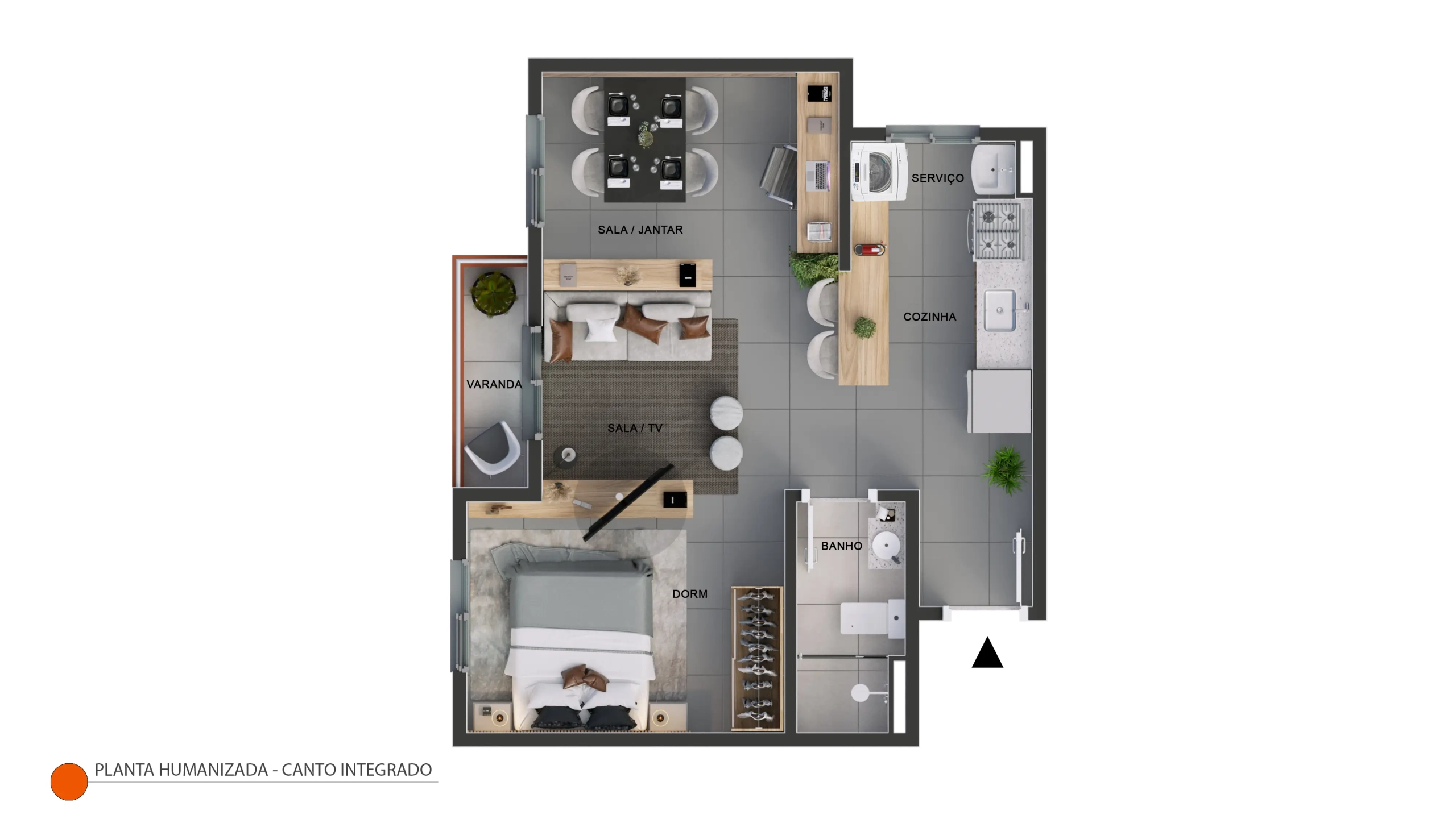 Apartamento térreo de canto com 40,61m² de área privativa + quintal privativo de 21,77m². Composição: 2 dormitórios, 1 banheiro, varanda, sala integrada, cozinha, área de serviço, 1 vaga de garagem. Posição de canto privilegiada com o maior quintal privativo do empreendimento. Ideal para quem tem pets, crianças ou busca mais espaço ao ar livre. Disponível nos Blocos 01, 02 e 03.